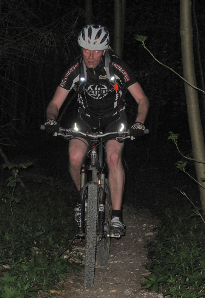 It couldn’t have been more of a change. Jimbo arrange to meet me at 6:30pm. We would be going to Stanmer. I don’t ride at night very often so at 5:30 I realised that I didn’t have any lights. I found some but then discovered that they needed charging. Not very organised! When we got to Stanmer it got worse. My front tyre only had about 15psi, the shock was too soft and the saddle about 10cm too low. Who’s been riding my bike? Faffers annoy me so I can’t imagine what Jimbo was thinking.