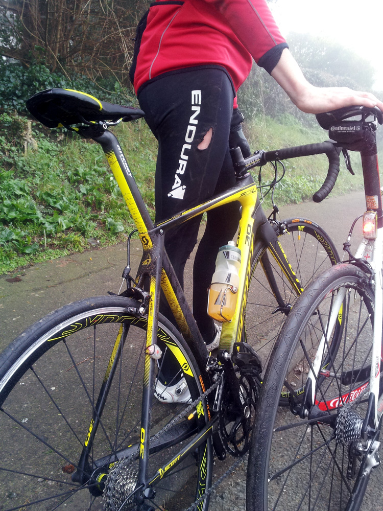 Today’s ride was relatively gentle as we are nursing a buddy back to fitness after a very nasty fracture of his leg so I can’t report that I was faster. I did, however, find the climbs easy despite not having the lower gear, the 25mm extra volume was really comfortable and the Black Chilli kept me upright. Joe, on his brand new Foil, went down. You could blame the wet road, the mud but more likely was his over excitement with a new bike combined with lesser tyres than he is used to. If you wonder why riders are happy to pay over £40 for road rubber it is because when you only have 23mm of tyre and probably only 15mm in contact with the road you need the best rubber you can buy.