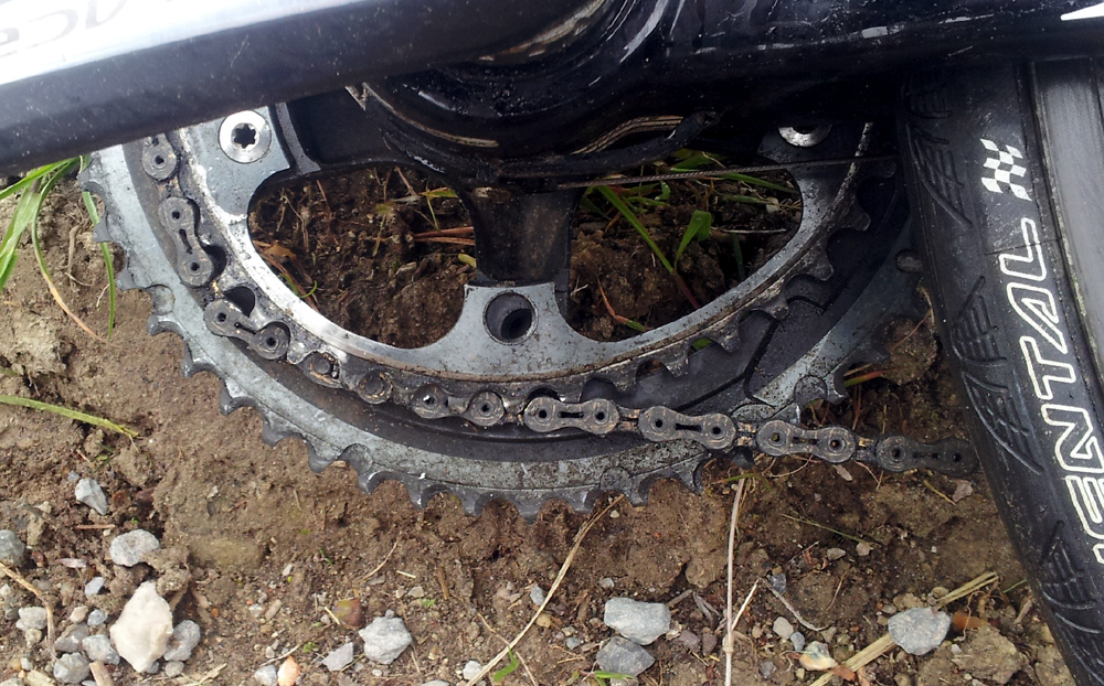I was riding local and left at 7:30am with a chill in the air but I only needed arm warmers for protection. It was going to warm up and it did. We flew along in the still conditions and our average stayed high until disaster struck. I warned that there was a steep hill approaching. It is 16% by Bignor Mill but seems much steeper. There was a loud crunch and a Dura Ace 39 tooth chainring bent over and made a perfect carbon frame cutting tool! The cause, other than my buddies sheer power, was a missing chainring bolt.