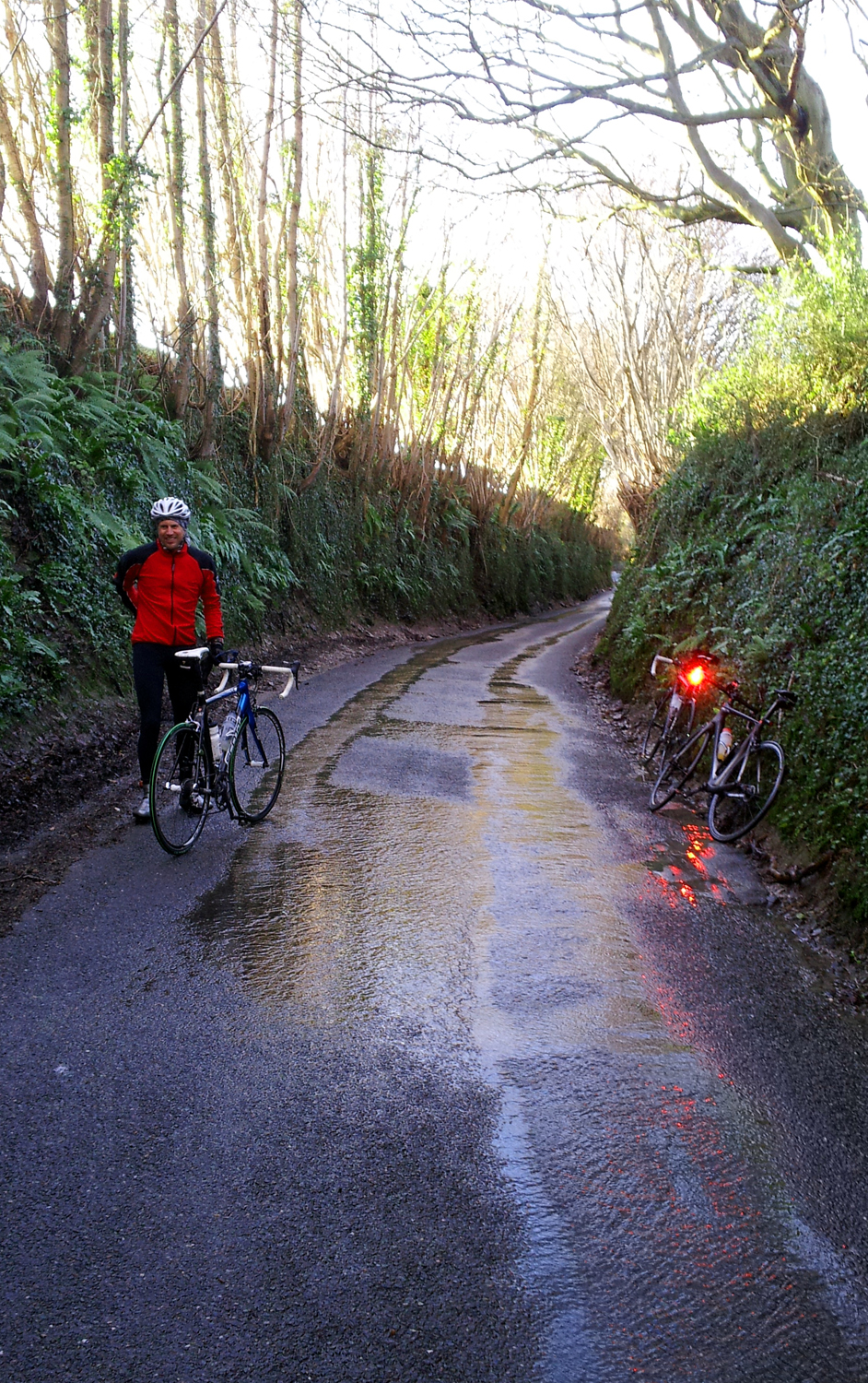 I know that I have been giving a positive spin to the weather and the road riding of late but yesterday was truly remarkable for January. It was more reminiscent of May. The sun was out, it was mild (Jon wore shorts!), the sky was blue and the roads cleaner than I have ever seen them. The only unusual feature was the amount of water laying or flowing across the little lanes at the base of the Downs.