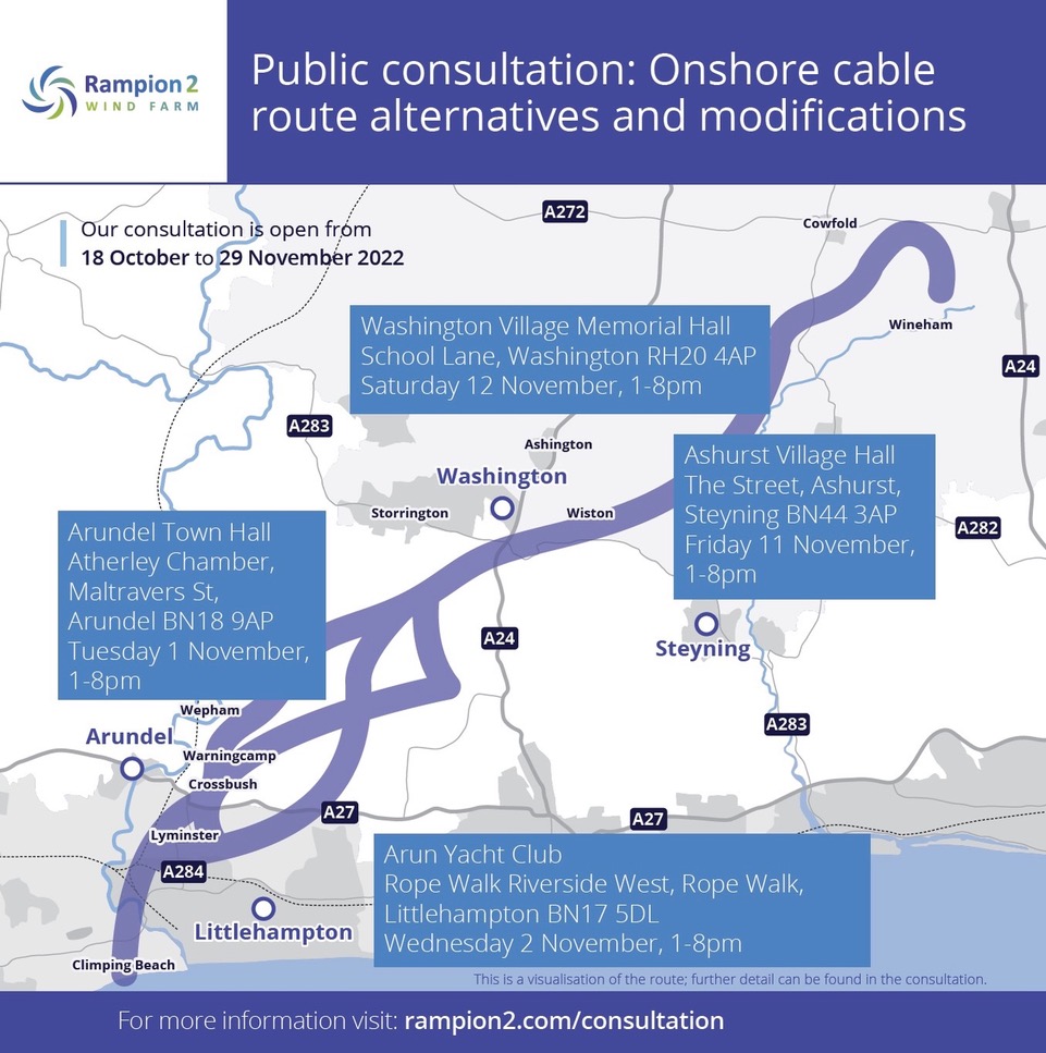 You have a chance to find out about the on shore cable route proposals for the proposed wind turbine power due to be lighting our homes by the end of the decade. The picture lists venues and dates.